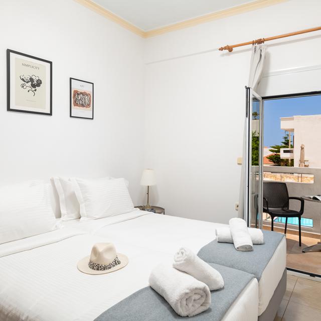 De sfeer is warm en persoonlijk, met die typisch Griekse gastvrijheid die je meteen thuis laat voelen. De kamers zijn eenvoudig maar keurig verzorgd, met lichte tinten, houten details en een balkon waar je ’s avonds in alle rust geniet van de dag.