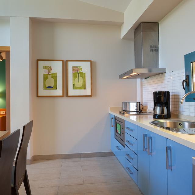 De moderne appartementen zijn kleurrijk ingericht en van alle comfort voorzien. Zo beschik je bijvoorbeeld over een mooie keuken en een groot balkon of terras. Indien je geen keukenprins- of prinses bent, kan je natuurlijk ook aanschuiven in het restaurant.