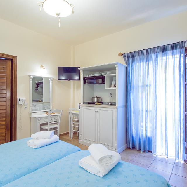 Bij aankomst bij de charmante appartementen Marouso kom je door de zware houten deur terecht op een binnenplaatsje waar de appartementen omheen zijn gebouwd. Via trapjes wandel je naar je typisch authentieke appartement, die netjes en verzorgd zijn ingericht. De ligging is zo goed als in het centrum van Skiathos-Stad. In de sfeervolle oude haven van de stad kun je lekker verse vis eten en kijken naar de bootjes die af en aan varen.