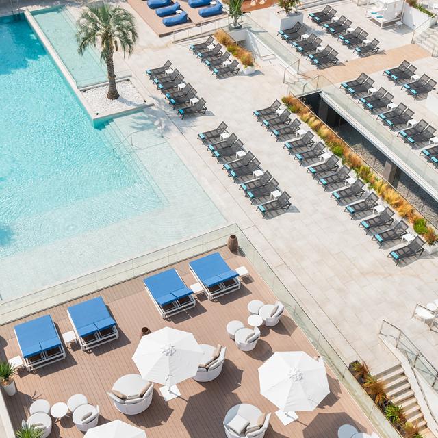 Hotel Vibra Algarb ligt perfect: vanaf het terras, dat om het zwembad heen ligt, loop je zo het schitterende, langgerekte strand van Playa d'en Bossa