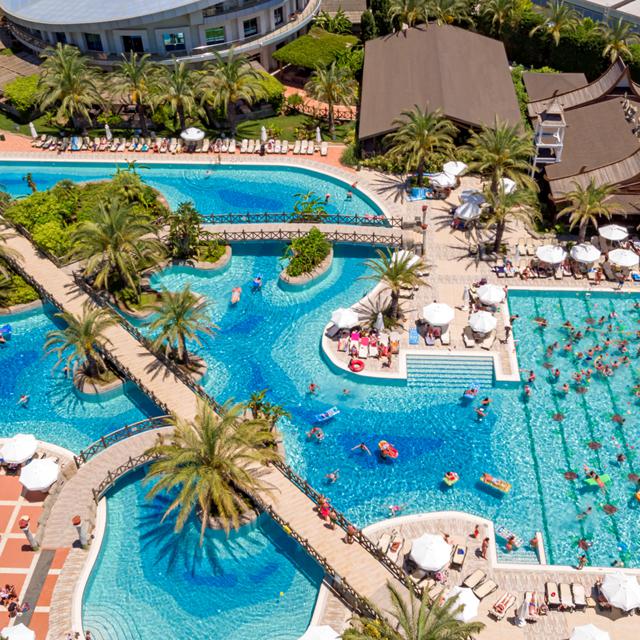 Hotel Royal Wings ligt aan het goudgele strand van Lara. Het zwembad kan eigenlijk niet groter; je kunt zo’n beetje door het hele resort zwemmen! Het zwembad kronkelt door de weelderige tuin en eroverheen loopt een lang wandelpad dat tot aan het langgerekte zandstrand leidt. Vanaf het pad leiden allerlei bruggetjes steeds weer tot een ander restaurant, gezellige bar of heerlijk zonneterras.